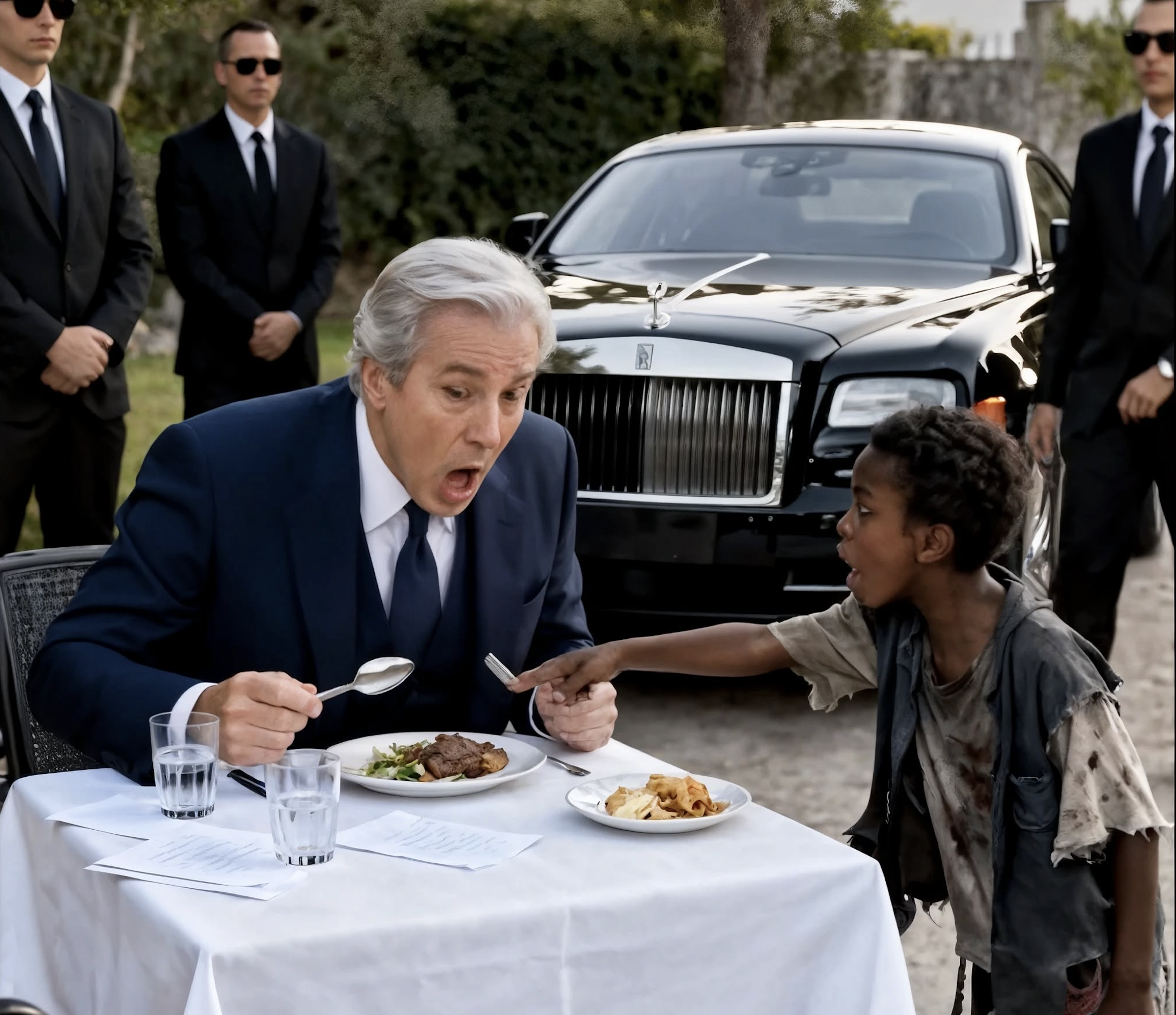 A little boy, barely eight years old, stood near the hedge at the café entrance. His clothes were dirty, his hair tangled, and he clutched a ragged teddy bear to his chest. His large brown eyes shone with terror.