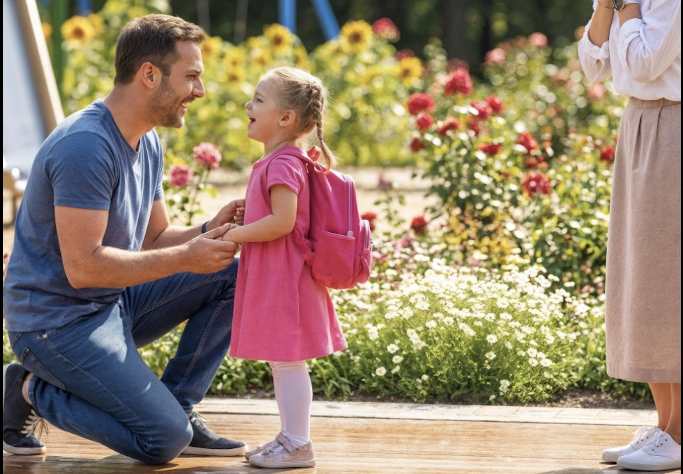 Near the flower beds, a man in a blue T-shirt approached, holding a little girl’s hand. His smile was warm, welcoming, the kind that immediately puts you at ease. He knelt down in front of Emma and introduced himself.